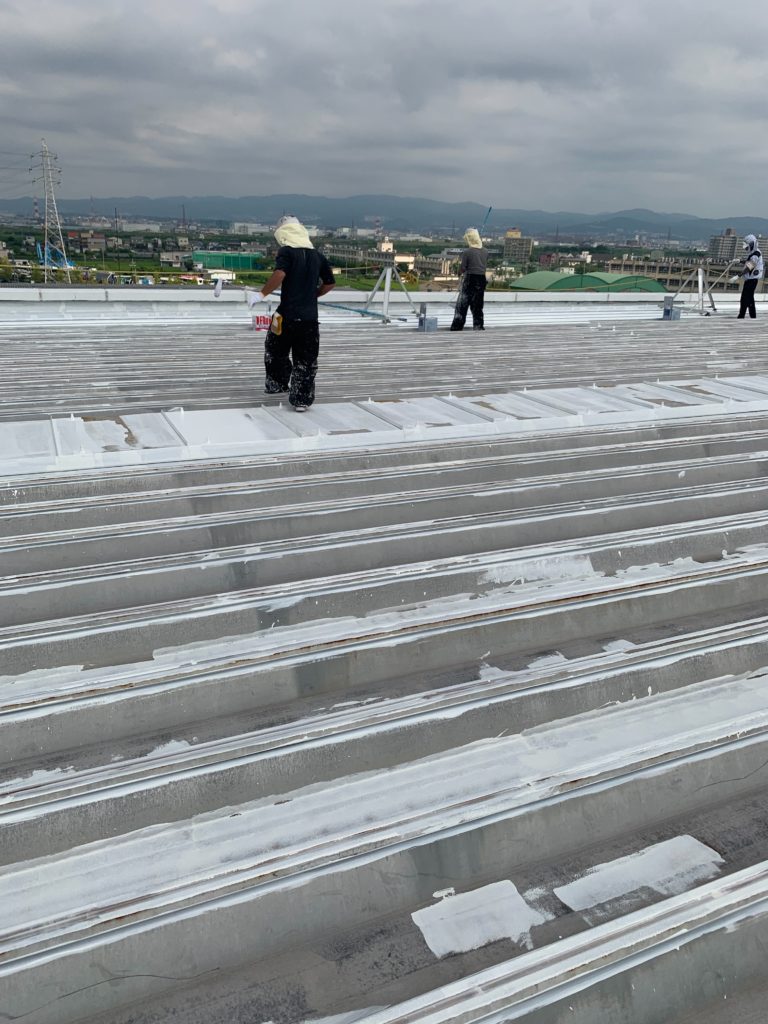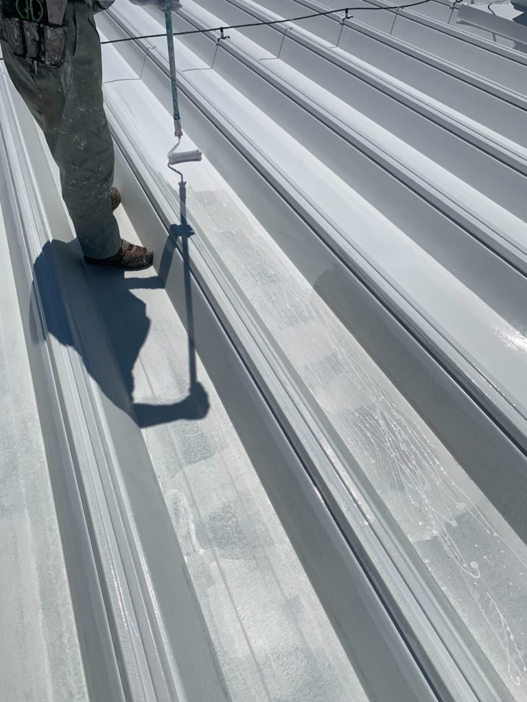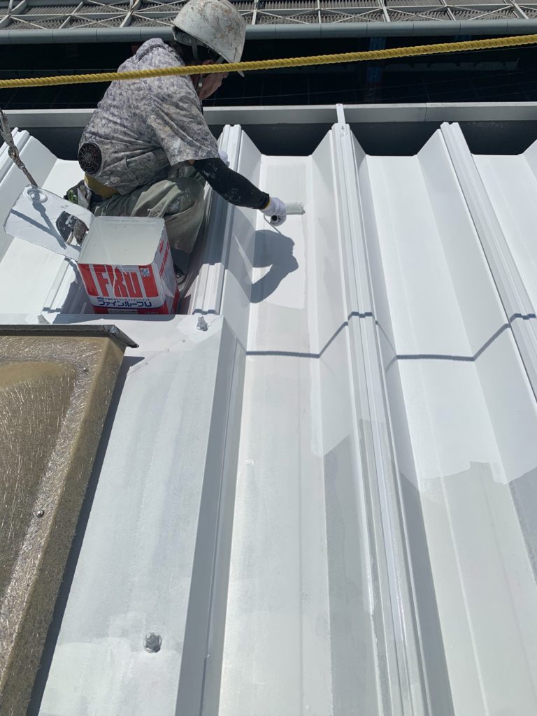 屋根塗装は白塗料で、1度目の塗装していきます。